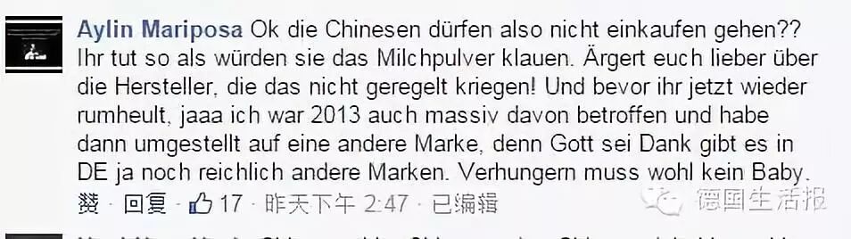 这位网友则表示:难道中国人不可以购物了吗? 你们这样写标题就好像中国人是在偷而不是付钱买一样。现在德国出现这种问题,你们应该怪罪生产商而不是消费者。德国宝宝会因此饿死吗?德国有这么多种奶粉出售的说。
