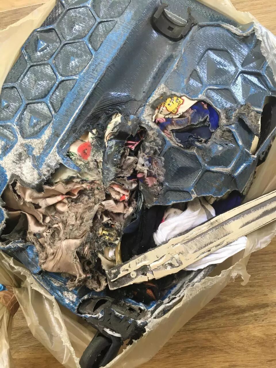 最近太阳报报导了一则新闻:一位女士搭乘EasyJet去罗马度假,托运行李被弄丢了。过了两周,行李找到了。可是已经变成了下图这个样子: