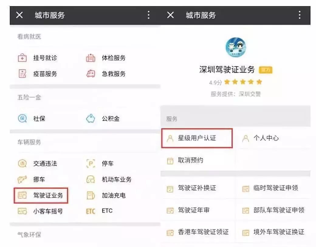 1.车主只要在微信钱包的城市服务页面,点击“车辆服务”中的“驾驶证业务”,再进入“深圳驾驶证业务”,完成“星级用户认证”后,即可申请电子证件。