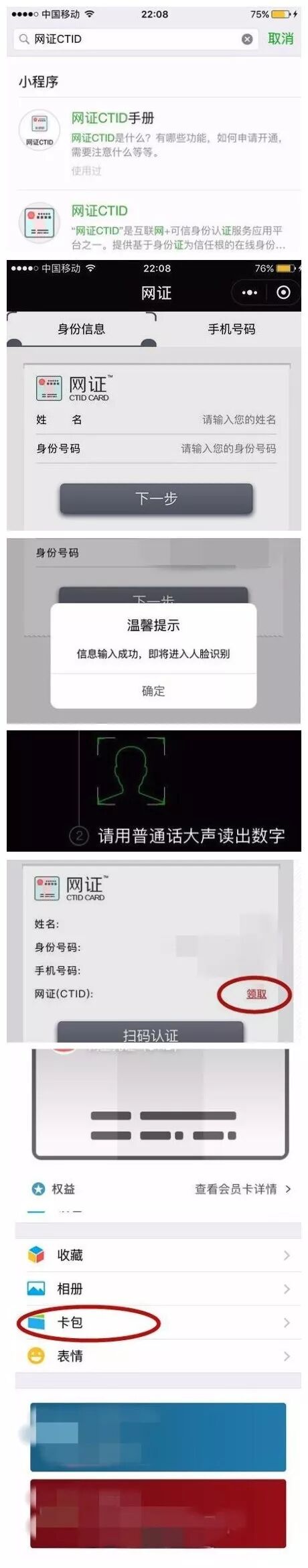1.在微信最上方搜索栏搜索“网证CTID”小程序。 2.输入相应的身份证号码和姓名等信息。 3.微信手机号授权,填写验证码。 4.进行人脸识别,并朗读相应数字。 5.注册成功,领取“网证CTID”,并保存到微信卡包。