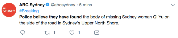 Sky News:警方确认,在M1 Berowra路段发现的尸体身份,是失踪的Qi Yu。