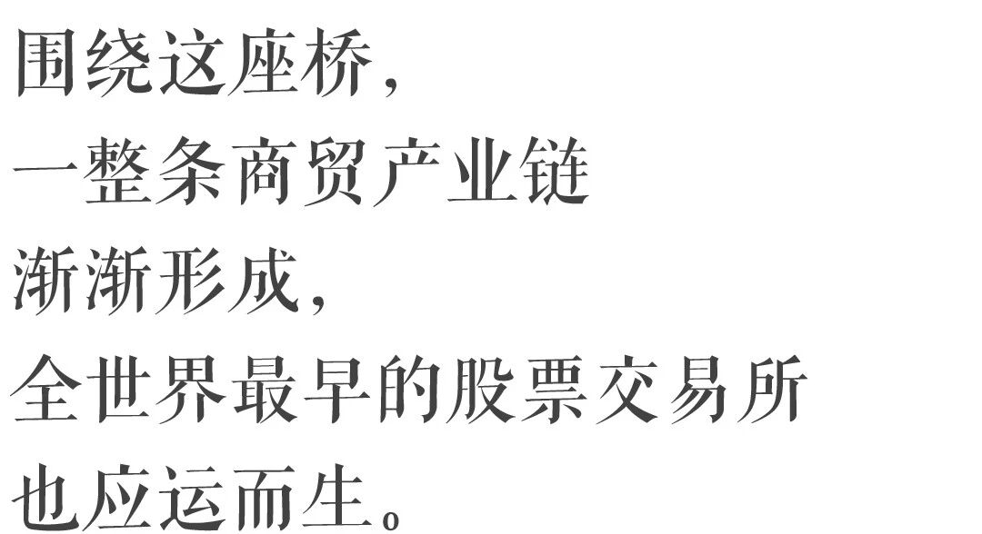 船只靠岸后,船长和商人会到桥上谈生意。 西边桥头有海关税局、拍卖场和邮局, 东边桥头有航运交易所和一些手工作坊。