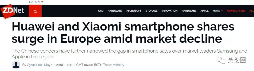 早在今年5月,美国电视网CBS旗下的科技类网站ZDnet,还专门报道过华为和小米第一季度在欧洲市场的“爆发式增长”(surge in Europe),前者售出740万部,同比增长38.6%,后者售出240万部,是去年同期销售额的十倍还多,分列欧洲市场份额的三四位。