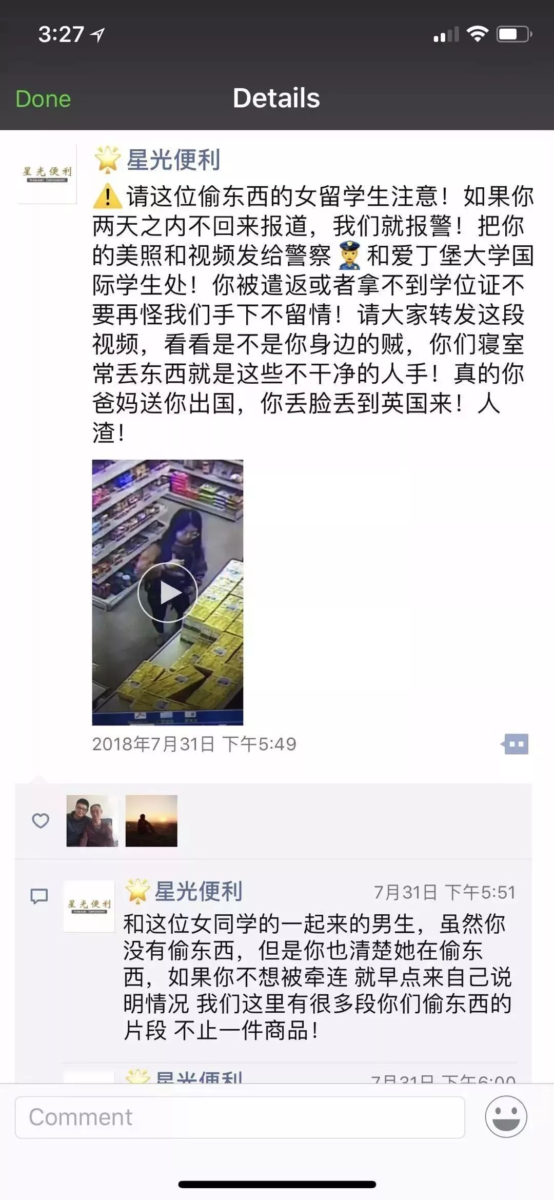 就在前几天,爱丁堡的一家名叫“星光便利”的华人超市在朋友圈发表了这样一则内容,矛头直指一名中国女留学生,称她同一名男生合谋盗取该超市里的货品,并且死不承认。