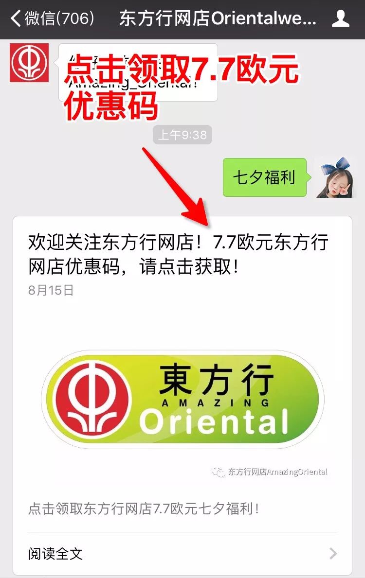 七夕(8月17日)至8月23日,只要您关注东方行网店发送“七夕福利”即可领取7.7欧元东方行网店的优惠Code!