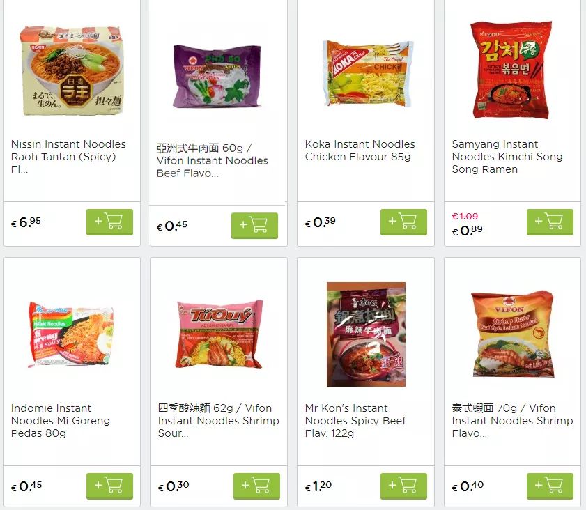 *冰鲜食品、新鲜蔬果属特殊运输类产品,最低订购金额为50欧元,运费 7.95欧元。 (冰鲜食品配送仅限荷兰境内) 作为懒人留学生的福音,怎么能少得了方便美味的方便面系列呢!