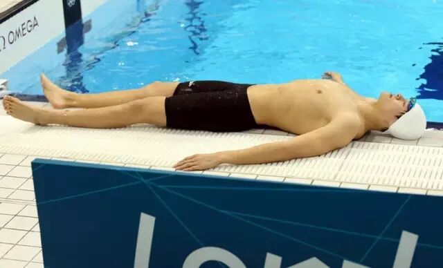 伦敦奥运会接力赛后累瘫在泳池边的孙杨