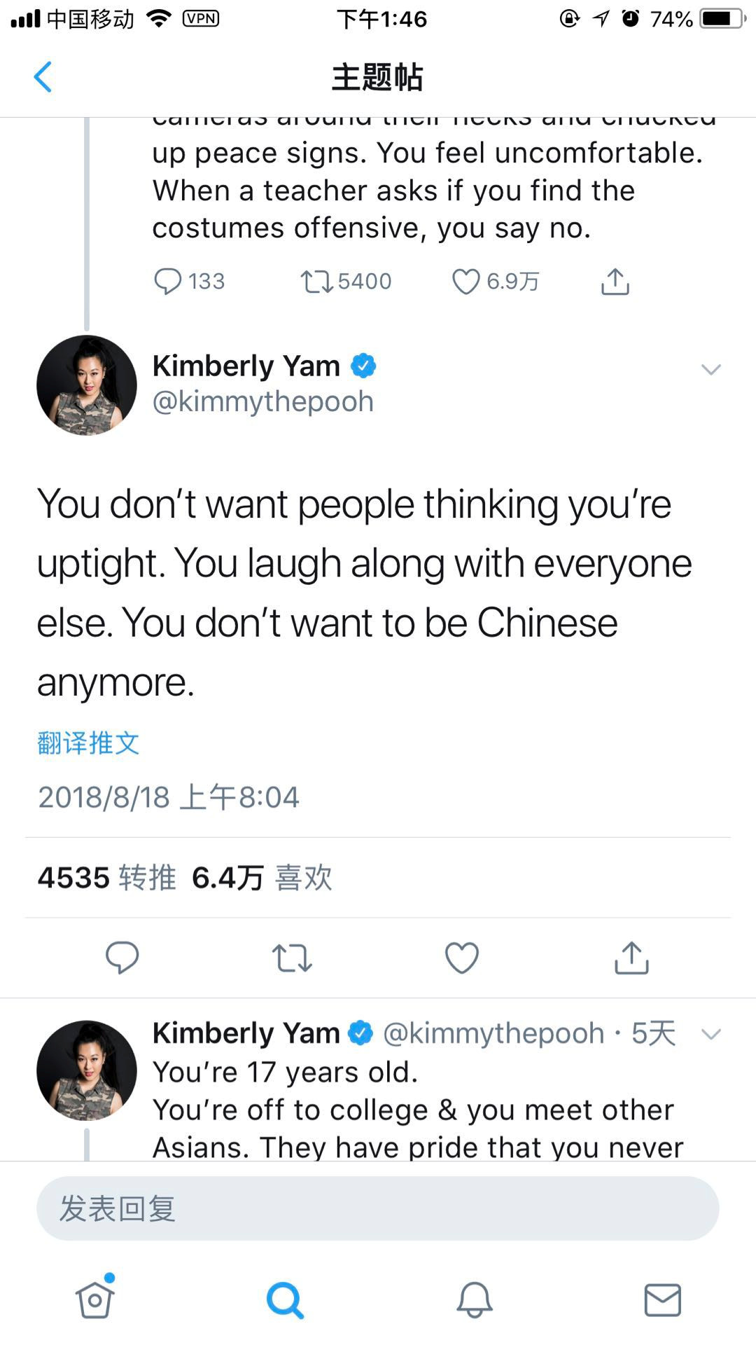 在金伯莉推文下数以万记的评论中,有人在埋怨自己的亚裔父母,埋怨自己的“异族血统”,有人在控诉,指责当年那些“欺辱”过自己的同学,也有人,在为当年的轻狂行为道歉。