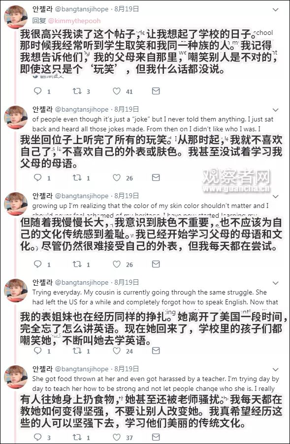 从一开始厌弃和排斥,到后来理解和接纳自己的种族身份和文化,Kimberly的帖子引起了很多人的共鸣。