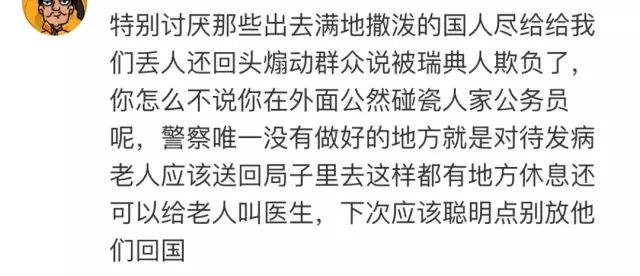 “把中国人就这么扔出去的行为实在太糟糕了。应该允许他们待到第二天早上的。这个行为太恶劣了!作为瑞典人我感到羞耻。这两个女警没有做好本职工作。”