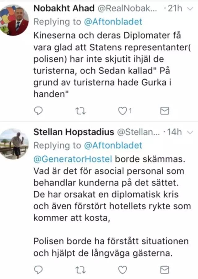 对此,当事人和酒店方各执一词。国外网友在推特上表达了自己对此事的看法。虽然有些网友评论中国游客“贼喊捉贼”,但大部分人还是选择了同情曾先生一家,并希望瑞典警方公开道歉。