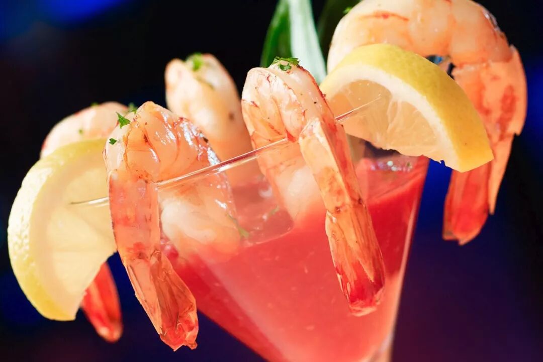 用马丁尼杯里面加入碎冰,放上一个蕃茄碗,里面放些各家餐厅招牌的酱料(原则上是塔塔酱)还有几支烫熟的去壳鲜虾。