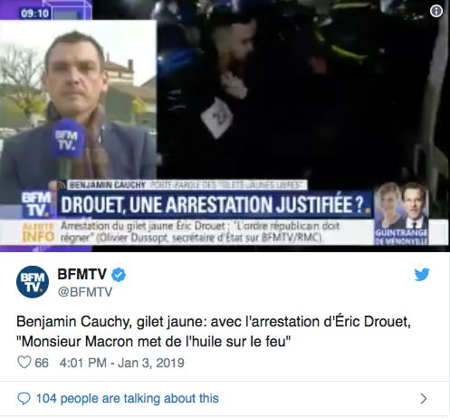 之所以情况变成这样,一个很大的原因是:黄马甲运动的头头Eric Drouet1月3号刚刚被捕了!