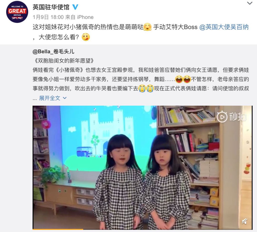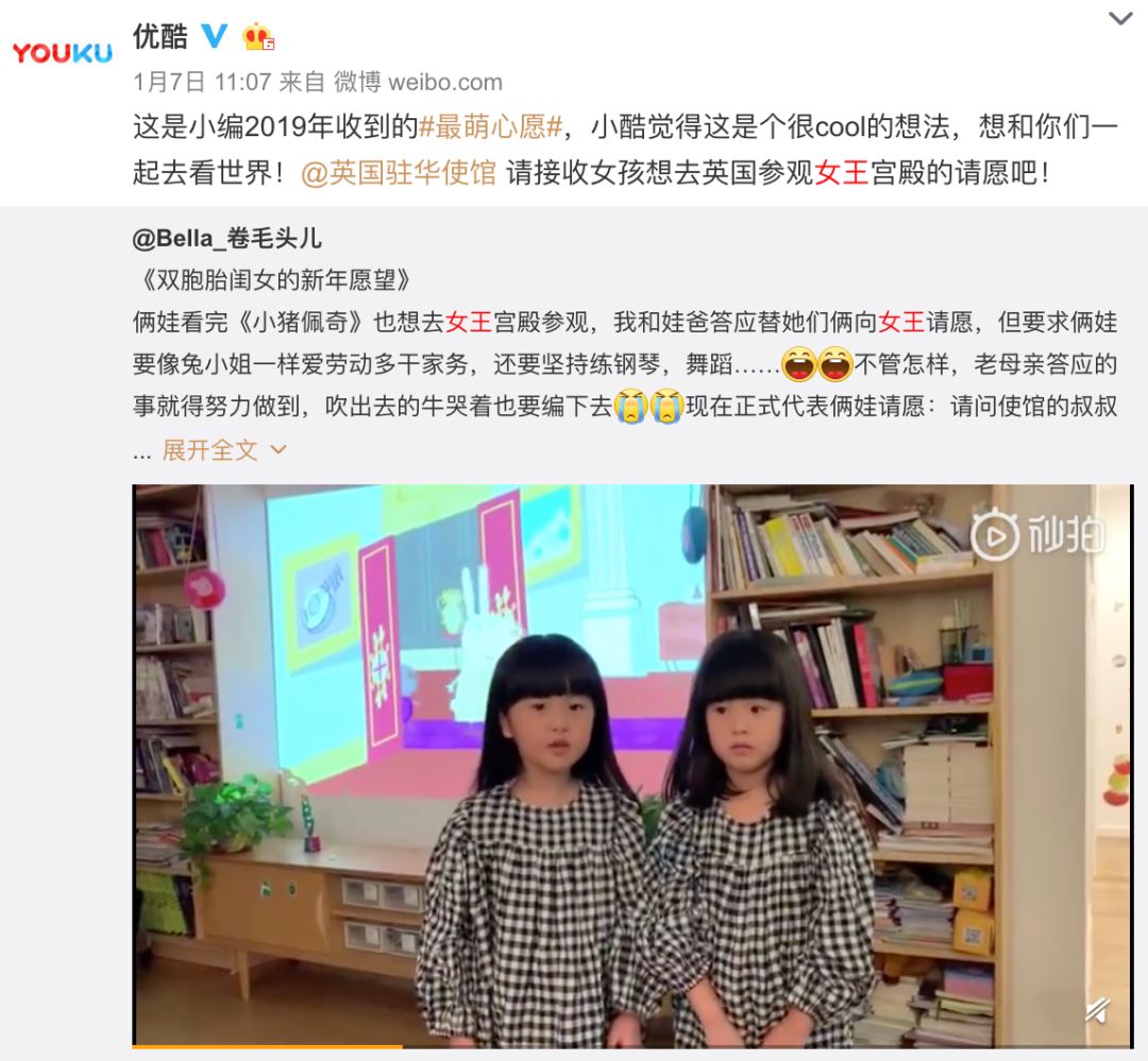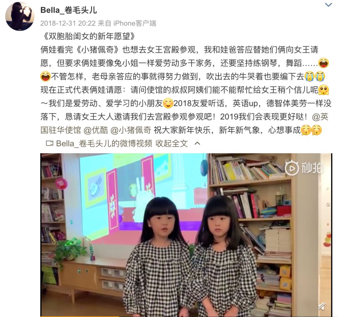 然而,2018年最后一天,这位老母亲抱着试试看的态度发了一条微博,同时艾特了英国驻华使馆、优酷和小猪佩奇,并附带了自己两个女儿的请愿视频。