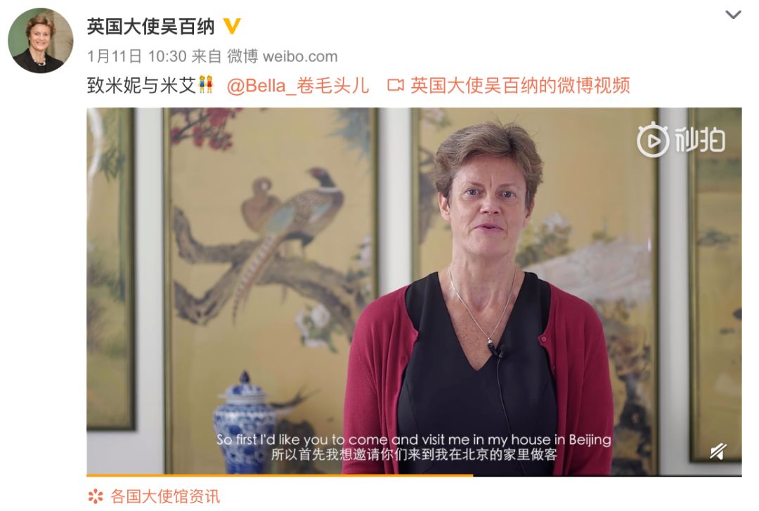 然后,英国大使吴百纳百忙之中不仅没有忽略这个特殊的请愿,甚至还亲自录了视频发了状态艾特了孩子妈,邀请这两位小朋友到大使官邸喝下午茶,顺便一起商量怎么实现梦想——到白金汉宫被女王接待参观女王后花园……