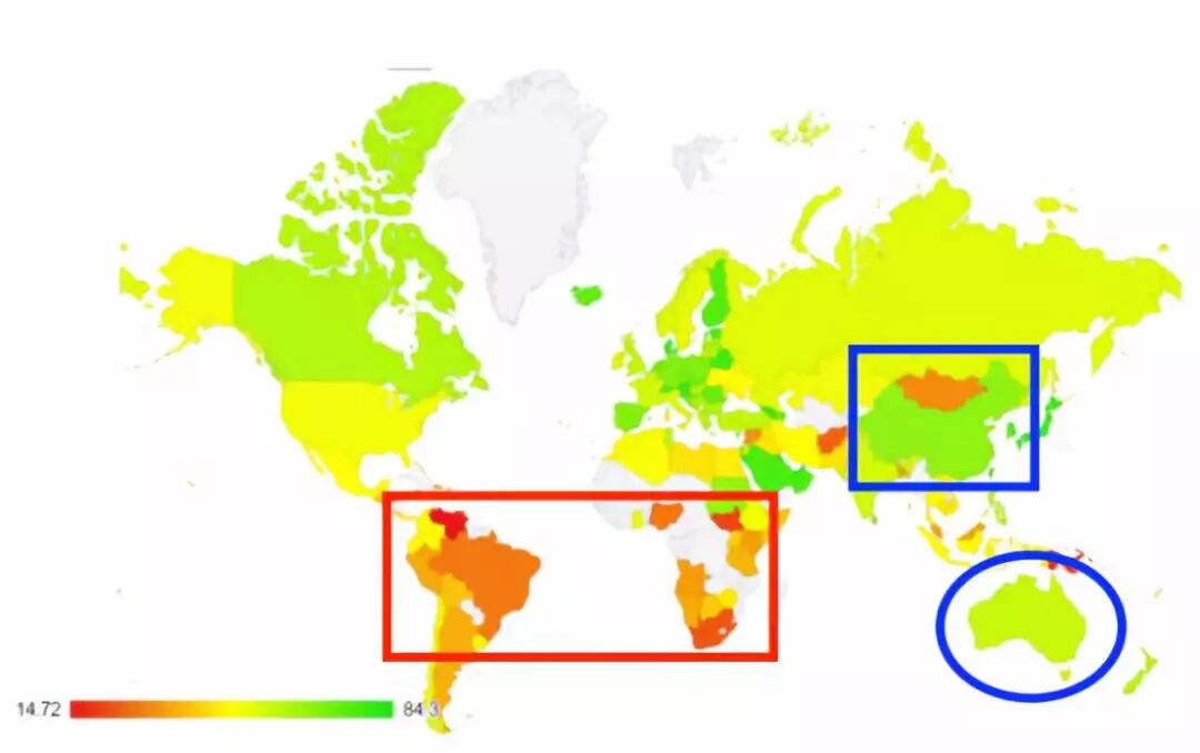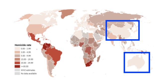 看完了安全指数,再来看下世界各国的谋杀率: 颜色越浅表示谋杀率越低,中国和澳洲都颜色极浅,这说明两国谋杀率在全世界而言,都是最低的。