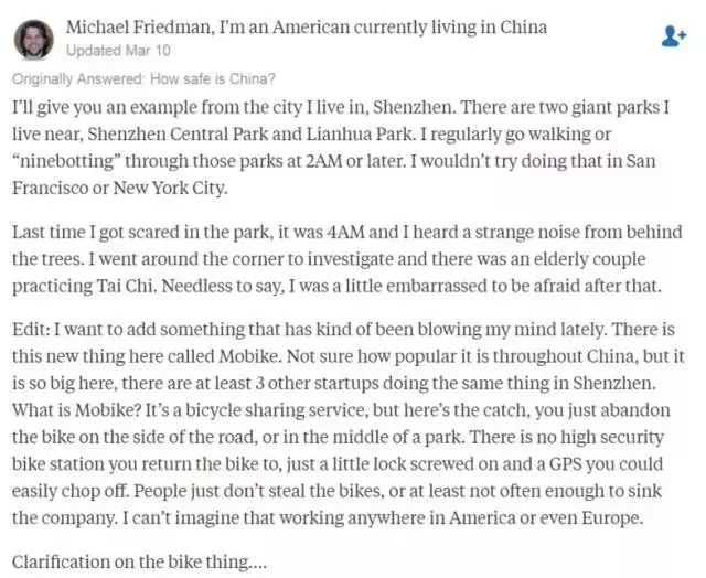 " 在我居住的地方附近有两个非常大的公园,深圳中心公园和莲花公园,我经常凌晨 2 点甚至更晚的时候穿过那里。我在三藩市和纽约的时候就不敢这么干了。"