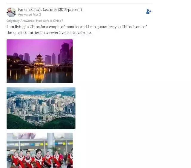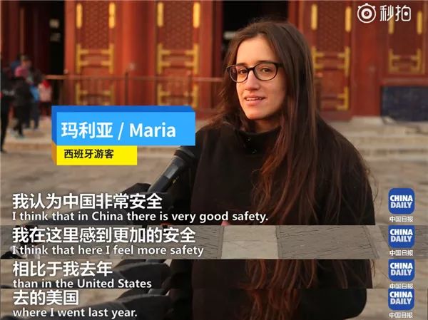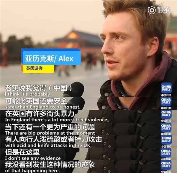 " 我已经在中国住了几个月,我向你保证,中国是我曾经去旅游或者居住的世界上最安全的国家之一。"