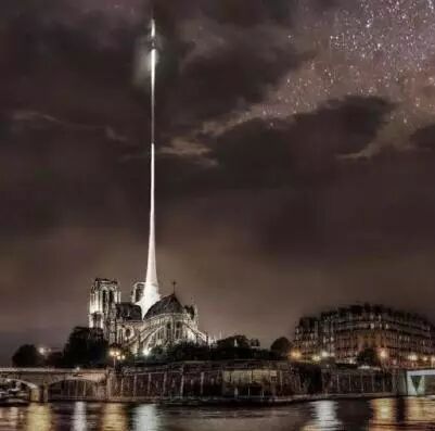 方案一:这个由斯洛伐克建筑师提出的方案是,在圣母院顶部安一个探照灯,营造出一种未来科技感,和与天空相连的视觉错位。