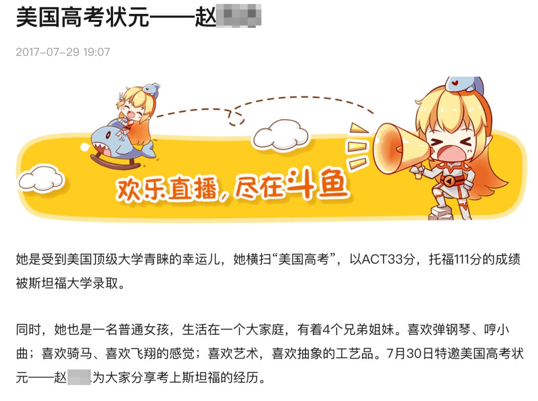 在以非法手段获得斯坦福的Offer后,Yusi Zhao曾自行在斗鱼上做了一次直播,并在宣传时自称是“美国高考状元”。