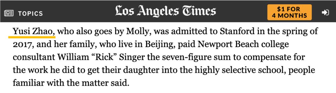 《洛杉矶时报》和《华尔街日报》同时报道揭露了这个被父母天价送进名校的中国学生的真实身份——Yusi Zhao,英文名为Molly。她于2017年春季,以本科生身份入读斯坦福大学,主修东亚研究专业。