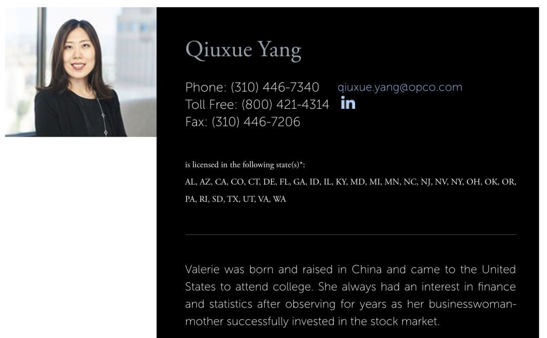 据报道,这名在Sherry Guo一家和辛格之间牵线搭桥的财务顾问名为Qiuxue Yang(英文名为Valerie),就职于Summa Group(隶属于奥本海默金融服务公司)。Summa Group的官网上写道: