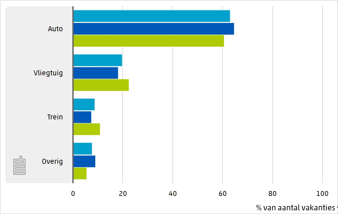 对于荷兰旅客的出行方式来看,63%的人选择开车旅行,20%选择飞机,9%选择火车。在夏季,荷兰人开车度假的次数相对多于冬季,在冬季,航空和火车方式出行高于夏季。