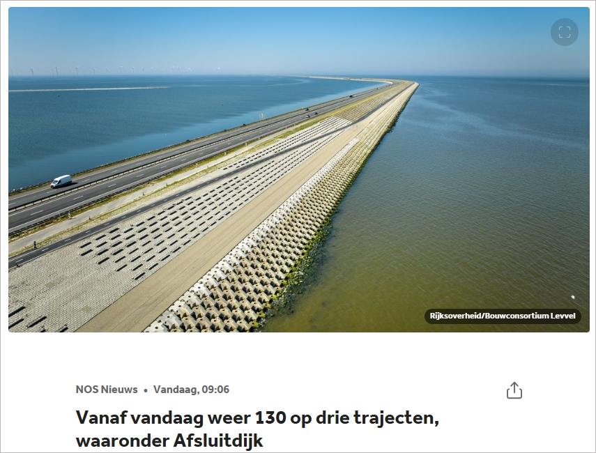 据荷兰媒体报道,自今日起,荷兰三条高速公路路段恢复全天130公里/小时的最高限速,包括A6高速公路(Lelystad-Noord-Ketelbrug)、Afsluitdijk大堤大部分路段,以及A7高速公路(Winschoten至德国边境段)。