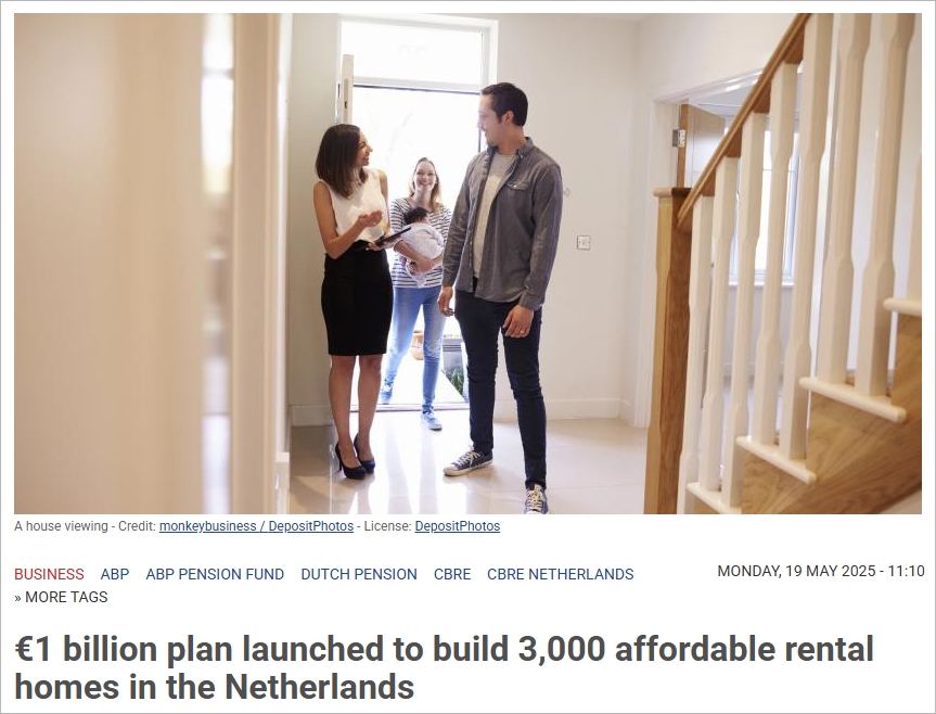 为缓解日益严峻的住房短缺问题,荷兰公务员养老基金ABP联合资产管理公司CBRE Investment Management启动一项总额达 10亿欧元的投资计划,未来五年将在全国范围内建设3000多套可负担的中等价位租赁住房。